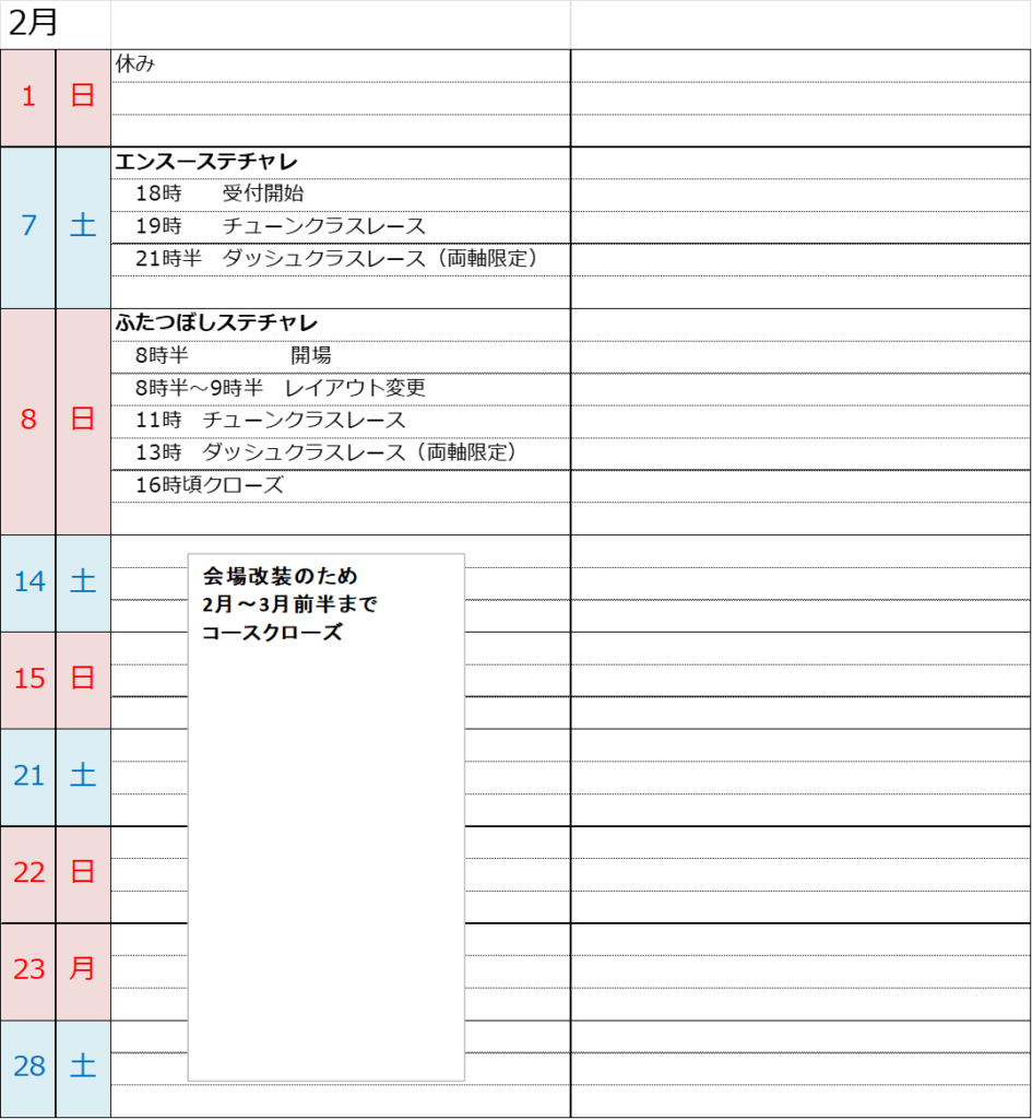 本業の出張等により予定の入れ替えがある可能性が御座います。随時更新します。